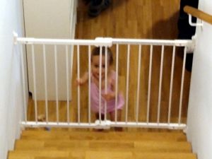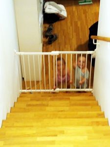 When Anna and her daughter arrived, they took them outside our door for a little bit, but Sammy did not want to be with them, but rather with me. So I held him for a while, while working, and he finally let me put him in the swing for a while. Then the other two came back in, and they're always the happiest when roaming around free inside, and that was the right strategy with them being so tired. I went upstairs to make their food, and they had both come to the gate and were looking up at me.