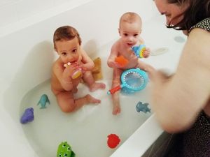 Then I put Tammy in, rather than putting them both in at the same time. She was perfectly happy. I had not only added their ducks, but also the new bath toys they received for their birthday. Then Emmy came. He was a little unsure but not screaming. He did get up and tried to hold on to me at first, but then he was fine and they were both playing. Thank God!