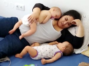 The babies were all tired, and I was impatiently waiting for our friend Anna to arrive to help us. I put Sammy into his bed, where he can sleep there, while the other two were crying downstairs, even though Randy was with them. Anna arrived at the right time!