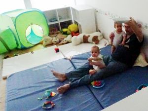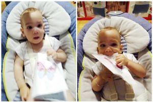 We spent some time playing with the babies, walking, and I was holding Sammy who wanted me to hold him, and he was in the swing next to me for a little bit. I gave him his birthday card to play with and he loved it so much, he took a bite out of it! I had to remove the paper from his mouth!