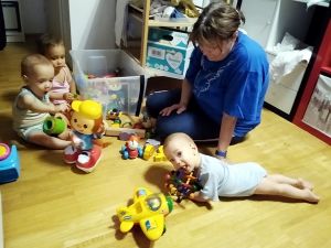 Our friend Sonja arrived to help at 1 pm - thank God - and she helped us feed them. Again we stayed at the dining room table and used the new high chairs. We then put Sammy to bed who needed a nap bad. The other two went downstairs with Sonja, but not for long. I could hear Emmy cry; he had woken up before we got home and was still very tired, so I got him and lay down with him. However, he wasn't tired enough, so I took him back downstairs.