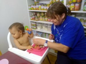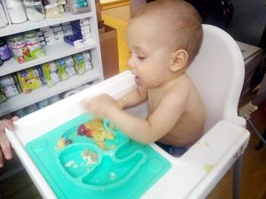 Tammy was really tired and hardly ate anything. She also did not pick up food and put it into her mouth, maybe for the same reason. They're supposed to start doing that which is one reason I got these plates. Now Emmy impressed us, because he was actually picking up food and putting it into his mouth. Great job, young man!