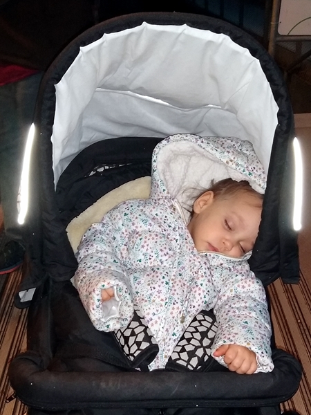 I set my alarm for noon, as we had to leave the house at 1 pm, but I turned it off and fell back asleep. Randy woke me at 12:15, and we fed them, then dressed them. Thankfully I had already picked out their clothes, and so we left a few minutes late, at 1:15 pm. Tammy was wearing a new, bigger coat, as the sleeves had been a little short on the last one, and it's cold now. It was also the first time that the sheep skins and sacks for their legs were on the strollers - except for Emmy, but at least his legs are more protected. The picture of Tammy shows her asleep on the way home.