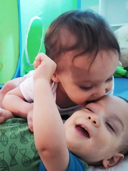 Also, Tammy and Emmy both walk up the stairs every day to the dining room. They have no problem climbing up, and enjoy when I take both their hands, standing behind them, so that they can go up upright, like adults, while holding on to my hands. I've noticed that Tammy actually goes left foot-right foot-left foot etc., like we do, while Emmy always moves up with the right foot.