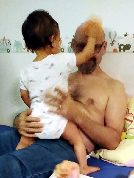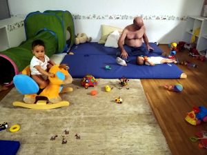 After Tammy had woken up and I had taken her downstairs, I went back to bed. It was Randy again who woke me up so we could feed them their lunch meal, which was at 12:40 today. We then took them downstairs, but Emmy was very tired, as he had only slept that half hour in the morning, so I lay down with him at 1:15, and he fell asleep right away and slept on me for an hour. I don't get to have him much, as it's usually the girl who sleeps on me. And unfortunately Sammy does not want to sleep on me at all, i.e. he just doesn't do it, even when he's tired. That will change on our trip when he'll be carried on my chest, I'm sure!