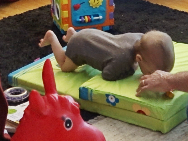 I fed Tammy and Sonja Emmy, and the girl ate it all and fast, plus cantaloupe which she loves and yoghurt. Then I put her to bed, while Emmy went downstairs with Sonja. I got the food for the adults ready and cleaned up. For a while Sonja was by herself with the boys downstairs, while we ate upstairs, then we joined them downstairs. I had fun with the boys. Sammy has been very active, moving more than usual, and seeming to be more able to pull up his knees under his body, which is the actual way to crawl. Today Randy put two small steps up (the physiotherapist always puts up steps for him), and he moved up easily, though it was slippery once on it. I'm uploading a video of it.
