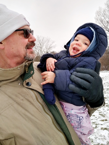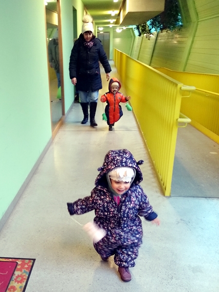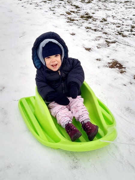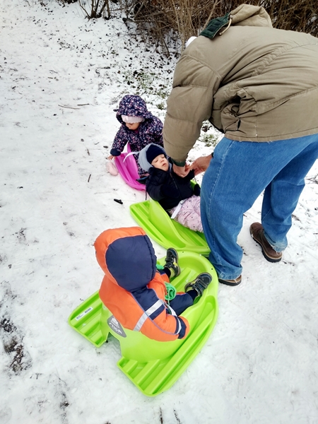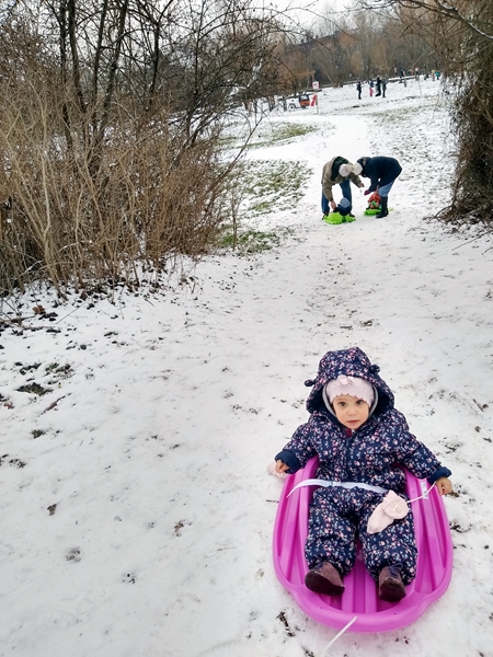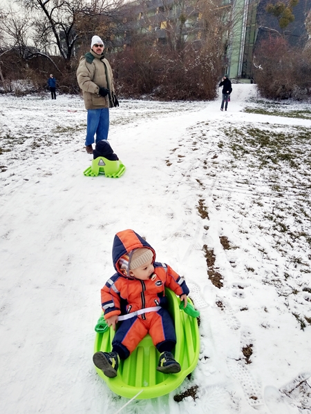 The boys woke up again just before 4 pm, and we immediately started dressing everybody to go outside. This morning there was fresh snow outside, and with temperatures rising again, today was the day to go outside with the sleds to take advantage of it. We went to the park right next to our apartment building, and were surprised at how many kids there were. The little hill had no snow left on it because of the hoards of kids sledding down. We ended up going up and down the entry into the park, which had an incline, and it worked really well, and no one else was using it. I gave them a little shove, and they'd slide down all alone, not fast, but at least a good distance, just right. Tammy was smiling all the time. We also pulled them on the flat surface, and I would run so Tammy got some speed, and again she had a big smile on her face. Today Emmy also enjoyed the sled, though he was not smiling like his sister. And Sammy did not like it too much; I don't think he was very comfortable sitting in the sled.