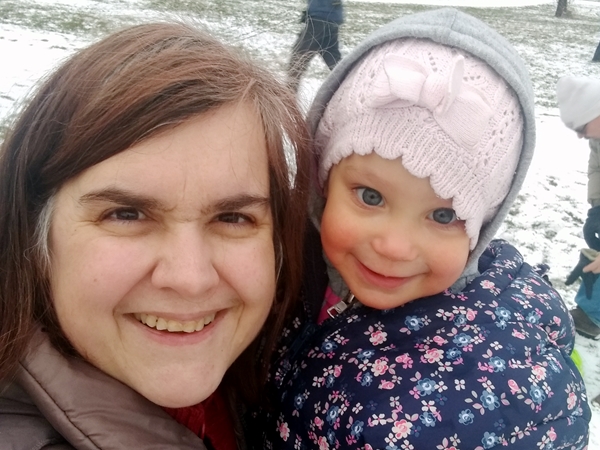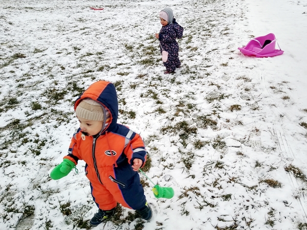 I also let Tammy and Emmy run around a little bit, and there mostly interested in the other kids. Emmy was pulling Tammy's sled for a little while. Tammy was getting really cranky, and so was Sammy, so we decided to return home. We hadn't been there long, but it was long enough. Tammy refused to let me put her down, and so I had to carry my heavy girl home, while Emmy happily walked home.