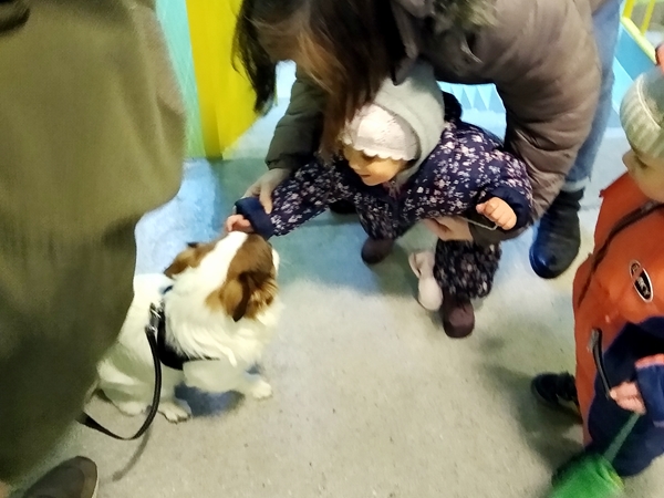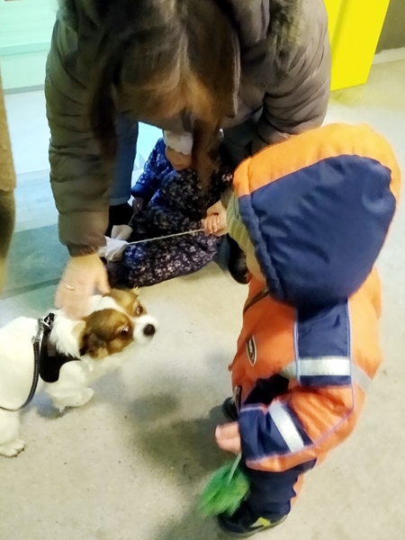 When we entered the building, there was a little boy with a little dog. He said he was a very friendly dog, and so Tammy and Emmy got to touch their very first dog ever. Emmy went first, cautiously and quickly touching him and retracting his hand, and I held Tammy's hand while touching him. It was great to see their reaction, and it was nice that the boy took the time to let them do that.