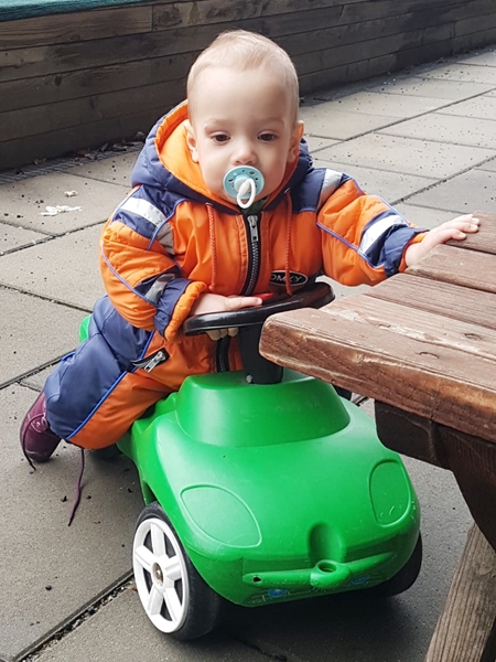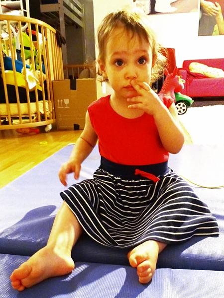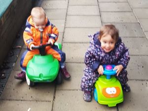 They were nearly done eating, when Caritas helper Christine arrived, and I went back to bed. However, I can hear everything, and so I stay awake until everyone is downstairs. Today Christine dressed Tammy and Emmy and took them right outside our downstairs door with two cars they sit on and move with their legs. They had fun!