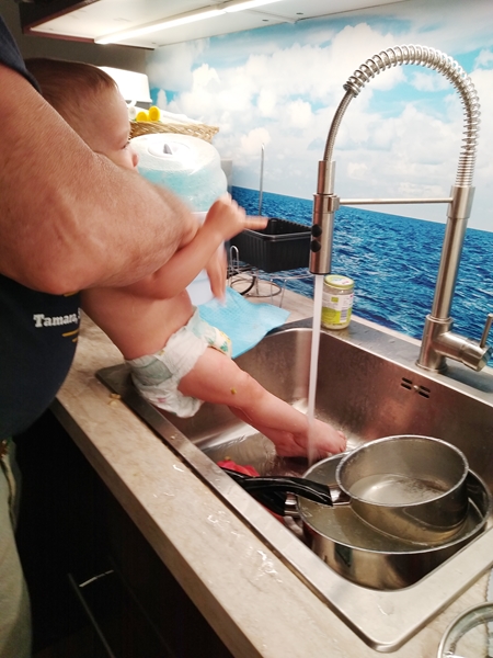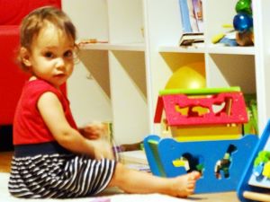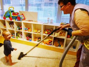 The doorbell rang at 11:30 and woke me up. It was the cleaning lady who had come to finish what she started last time. Christine was already in the kitchen cooking, while Randy was downstairs with the girl. I don't know if it was the doorbell, but the boys were awake, and I got them out of bed. The cleaning lady got busy, while Christine finished the food, and I put it on their plates so we could eat. I was feeding Tammy, and Christine Emmy. They didn't really eat very much; it was rice with chicken and vegetables. I then got some fruit and yoghurt out as well. After they were done eating, Christine went to get the cleaning rag, and then taught Emmy how to clean the table. I cleaned up and dressed Tammy and put her to bed, and she fell asleep quickly, and slept nearly two hours.