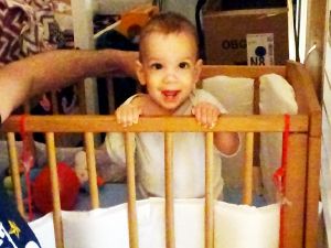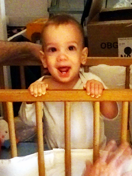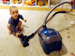 We all went downstairs, and the cleaning lady soon did too to vacuum the play area. Emmy was very skeptical and a little fearful of the vaccuum cleaner. When it was off, he was slowly approaching it to check it out, and when it was on, he was safe in my arms. When Randy came down with Sammy, he put him in his old babybed to be out of the way of the cleaning lady, and Sammy knelt in there, holding on to the railing, which is how he's supposed to sit. He actually likes pulling himself up into a standing position, but the physiotherapist said that's not good for him. Randy and I don't really know why; he sure seems to enjoy standing on his feet.