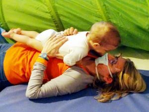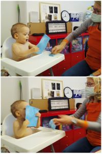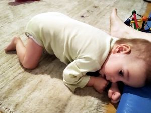 We then had another hour of playing together, before I had to leave to get dinner ready, and we had lots of fun. Sammy was crawling, and at one point actually pulled up both his legs under him, which is a big deal, as that is how you actually crawl, so the more he does it, the better. Most of the time he's just pulling his whole body with his arms, while trying to push with his legs.