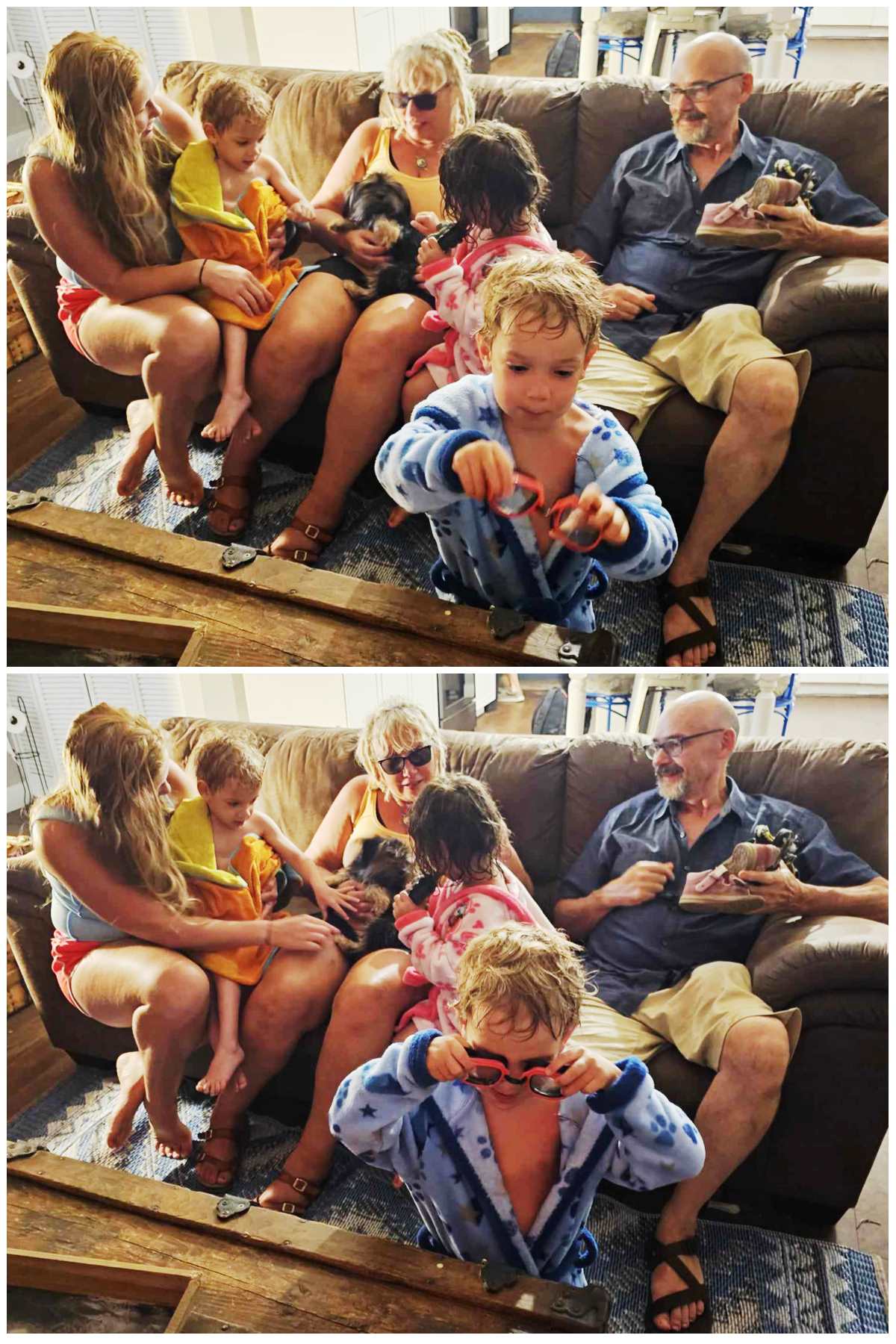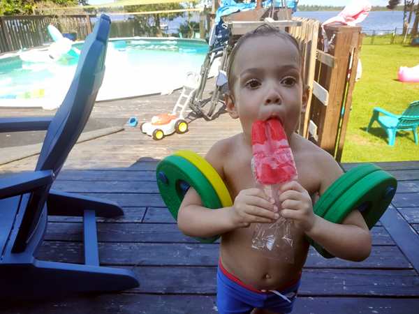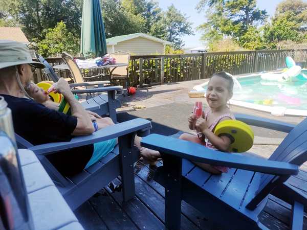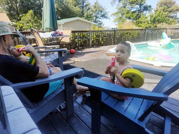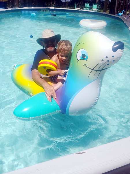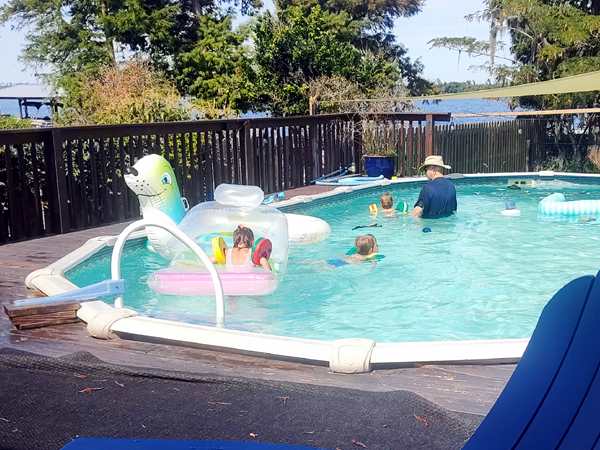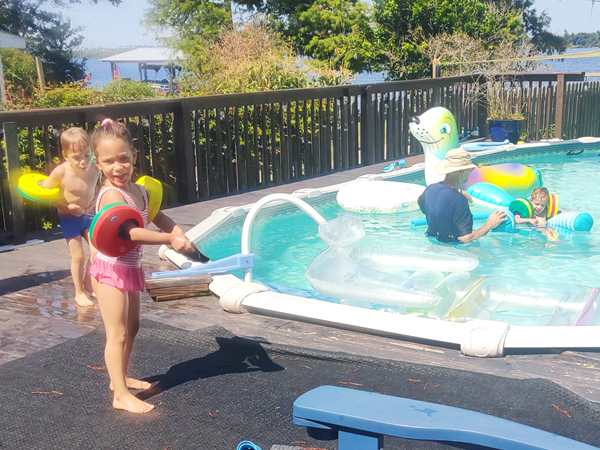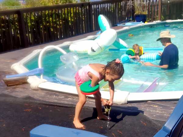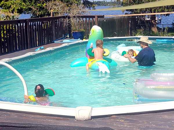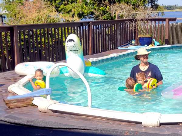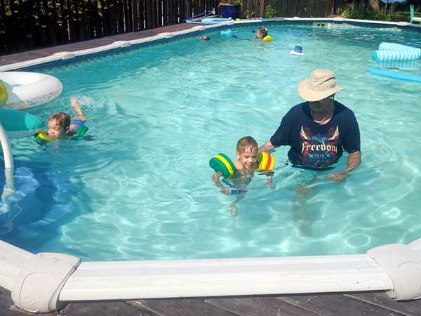 Day 1411. Today Emmy was the first one up again around 7 am. Our friend brought us some breakfast, then we put their bathing suits on and went to the pool. I already started teaching at 9 am today and was doing two hours. The kids were in the pool the whole time I was teaching, sitting there right by the pool. Once I finished at 11 am, I was finally able to join them in the water and had lots of fun with them. Tammy had red eyes again from jumping and diving so much. Sammy wanted to be with me the whole time again, and Emmy wanted me to dive to them, which made him giggle, as he was trying to get away.
