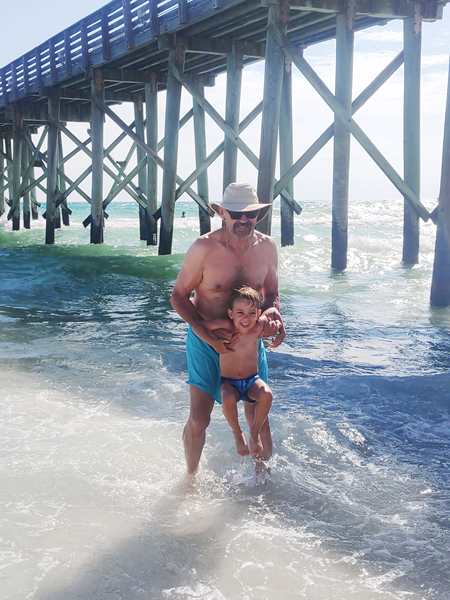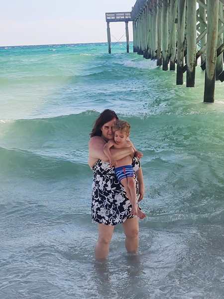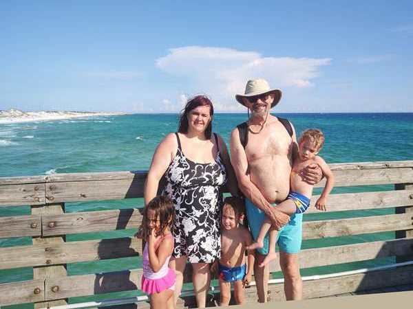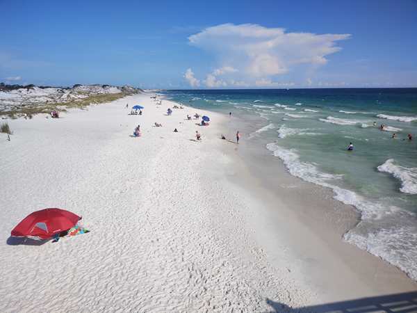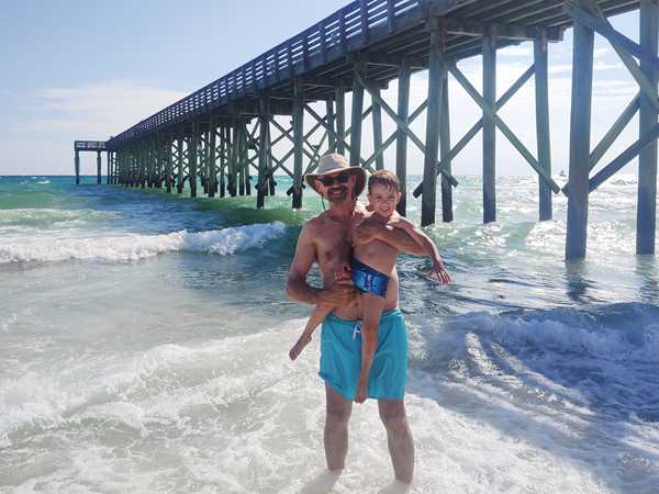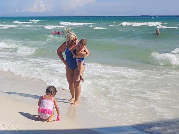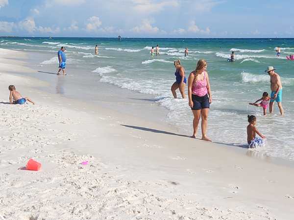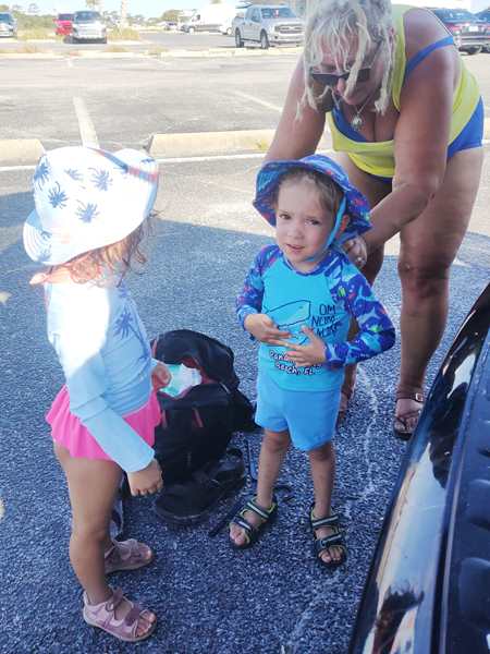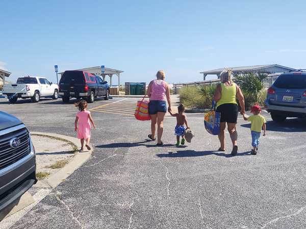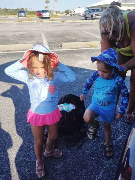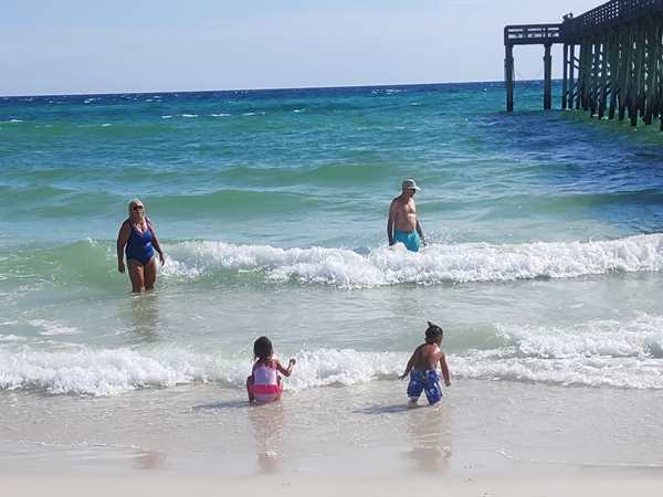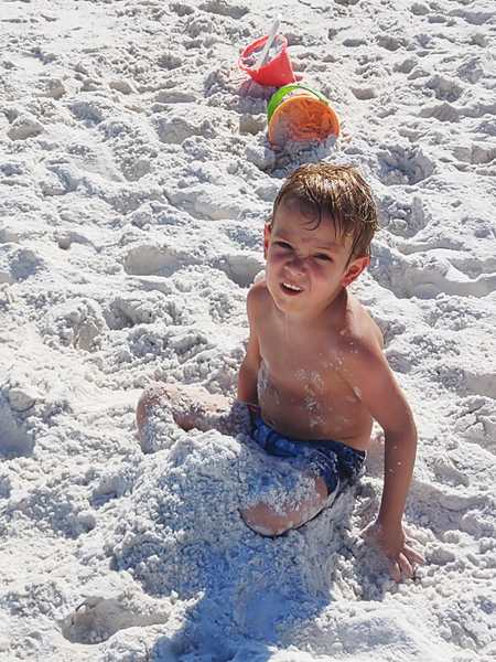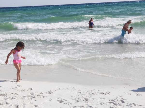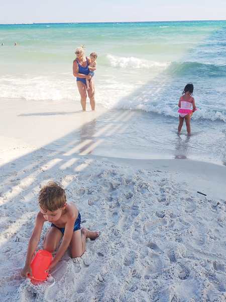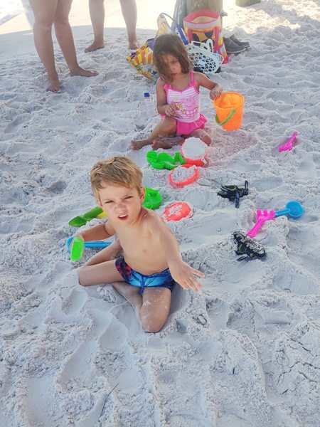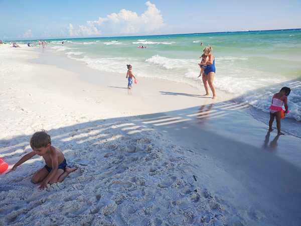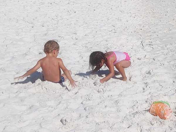 It had taken time to get them ready, and it always takes time to strap them into their seats, and so it was 2:50 before we drove off to go to Panama City, which is right on the coast. We reached the state park at 4 pm, paid to get in, and parked the car by the beach, right next to our friends' car. We then walked to the beach right there. The sand was white, and the ocean was rough. The yellow flag was out. The kids were pretty excited. Emmy had been saying for a while that he was going to build a sand castle. The first and only time they had been at the ocean was during our brief visit to Mexico 13 months ago. At that time Tammy loved the sand and beach, but Emmy did not like it at all. It sure was different this time; he loved it all.