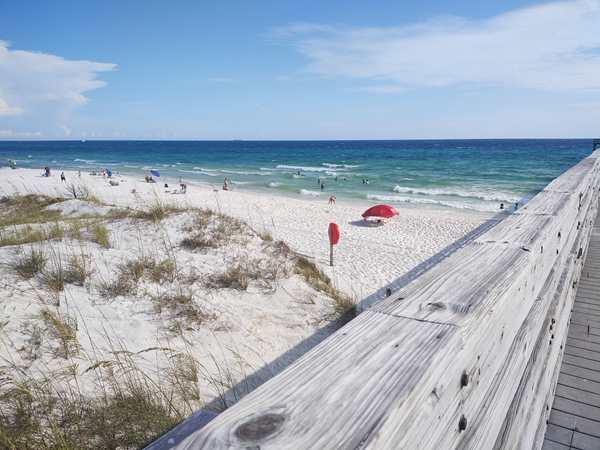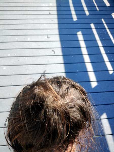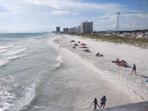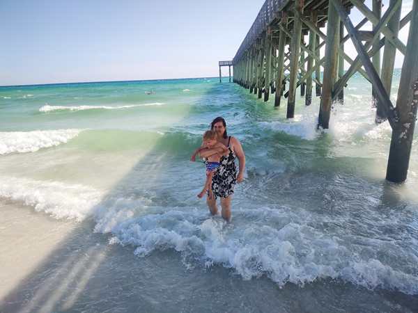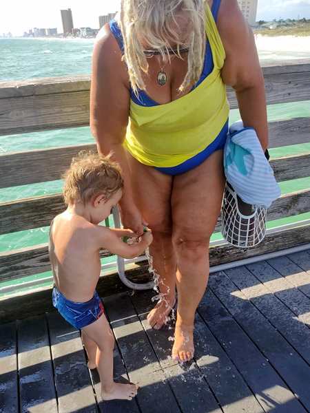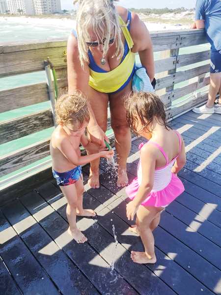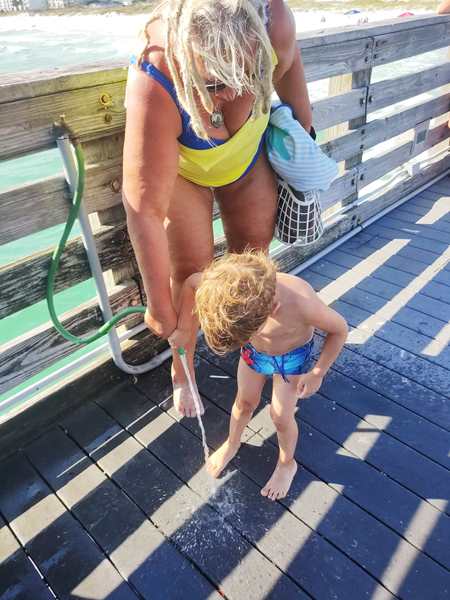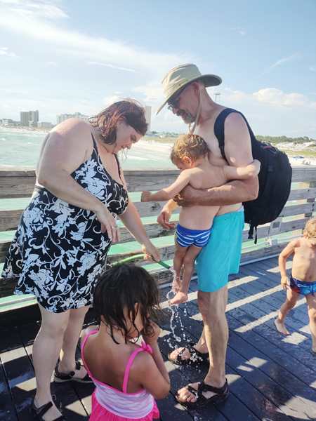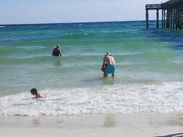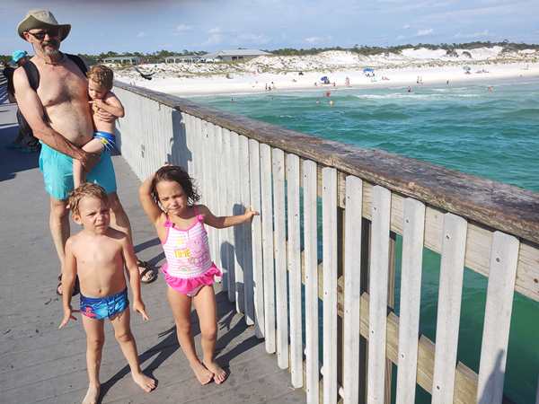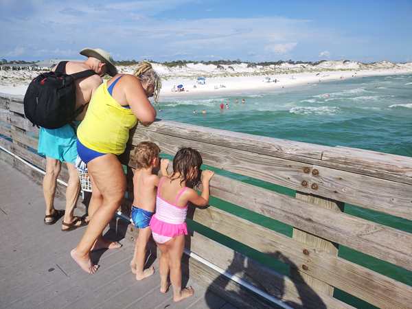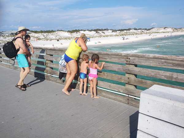 Over an hour had passed, when we packed up our stuff and walked up to the pier and to the end of it. You had a good view of the beach there, and we could also see fish in the water. Our friend said that you could also see dolphins and turtles at times, but that was not the case today. A few people had fishing lines in the water from up there. There was a faucet, and so we all rinsed our feet off. Tammy thought it was funny to see her footprints on the wood because her feet were wet, and was disappointed, when her shoes didn't leave any prints.
