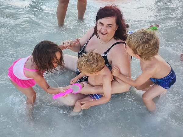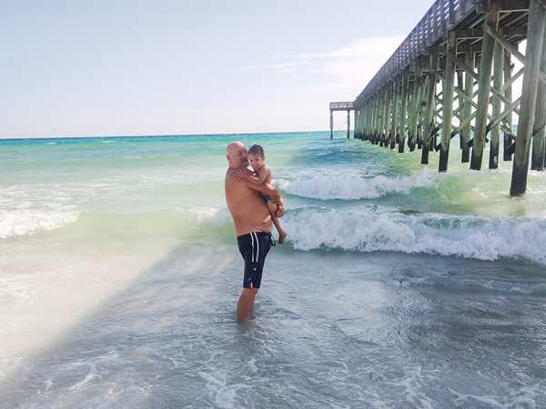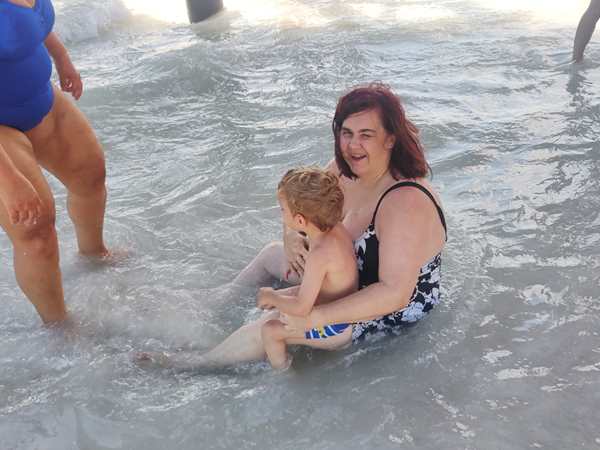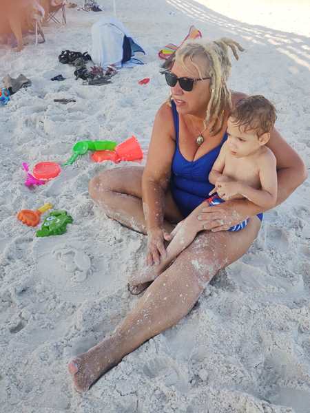 We stayed near the pier because of the shade there, as I was already sun-burned and to protect the kids. I went straight into the water with Sammy and was amazed at how strong the currents were. We always stayed in the very shallow water, where I sat down with him and let the waves hit us. He really enjoyed it for some time. But then he was getting a little cold because of the wind in the shade, even though the water was extremely warm.
