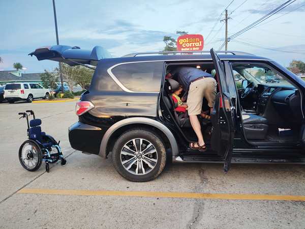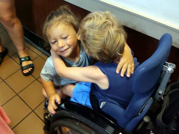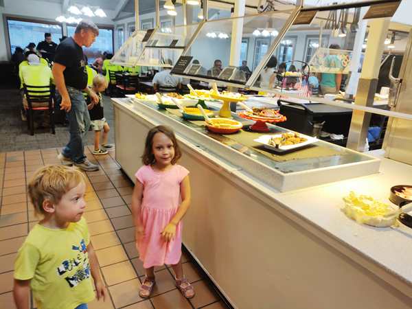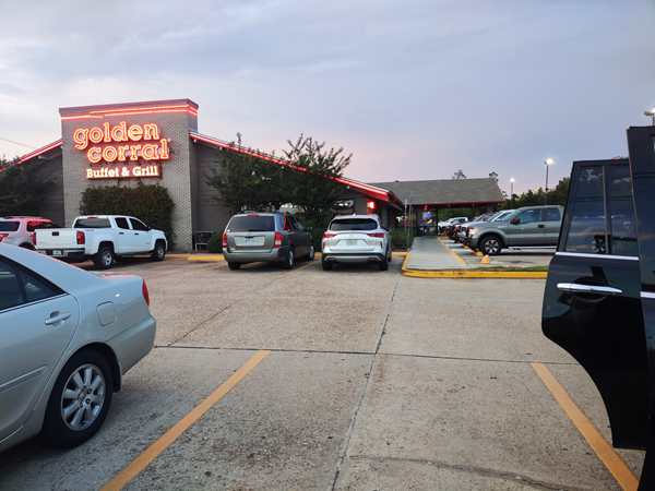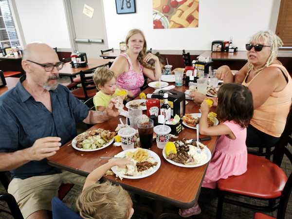 We then headed back to the car and out again to make a stop by gator lake, where you can often see some alligators that live there in freedom. However, there weren't any to see, which was disappointing. And so we got back into the car and left the park to drive to Golden Corral for dinner. We got there just after 6 pm. It was the first time we got the wheelchair out for Sammy. It was a blessing to be invited to such a nice place by our friends. It was the triplets' first buffet, and made me think of when I took Paul to a buffet for the first time. Sammy had some fans, when we were waiting in line, as some people were interacting with him, including the waitress later. We got our drinks, found a table, and then I took the kids to the bathroom before we got plates and went to look at the food that was available. Tammy was first, walking with me and telling me what she would like, then I did the same with Emmy. Next I got a plate for Sammy before getting myself a plate. I couldn't believe how busy the place was. It was full! I greatly enjoyed the steak I finally got, over a week after arriving in the States. The kids ate rather little, but Sammy was really hungry. And they all had desserts.
