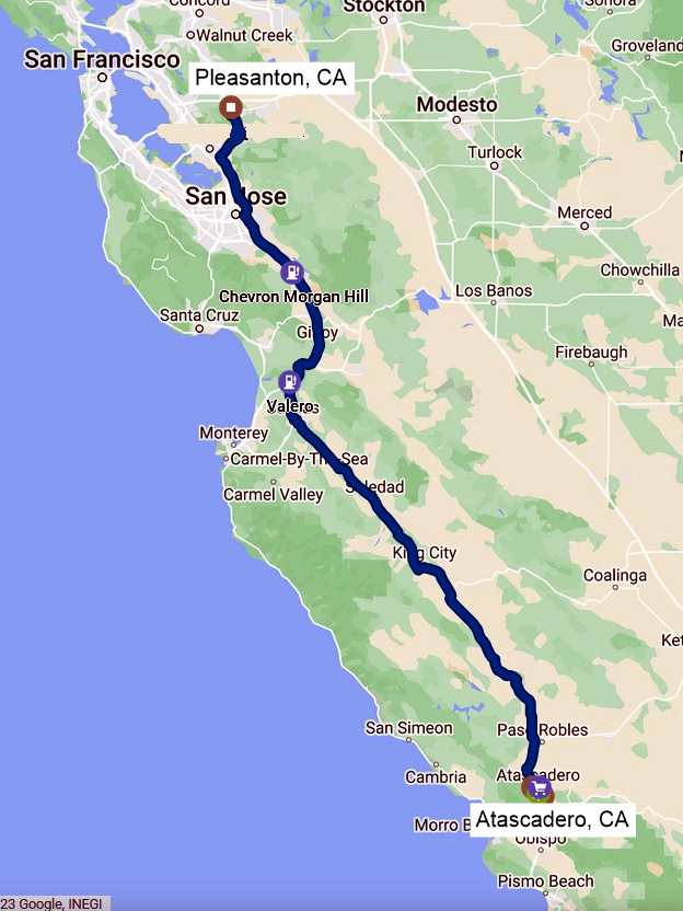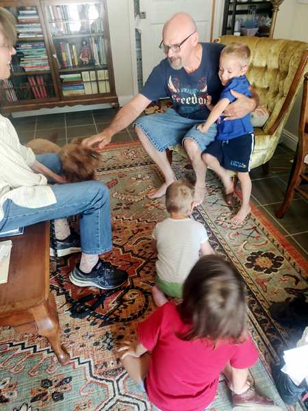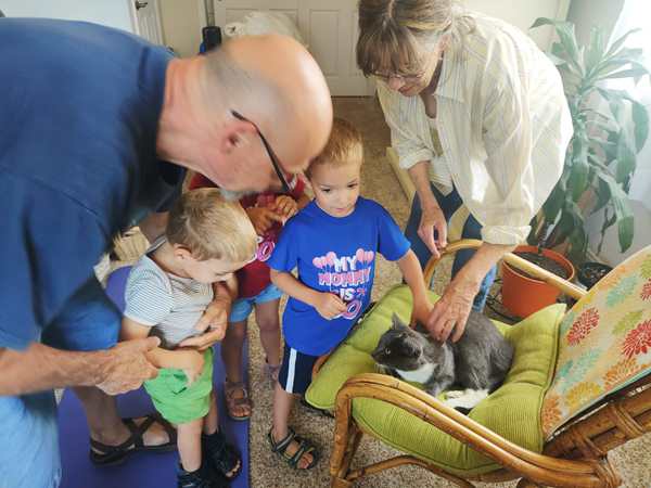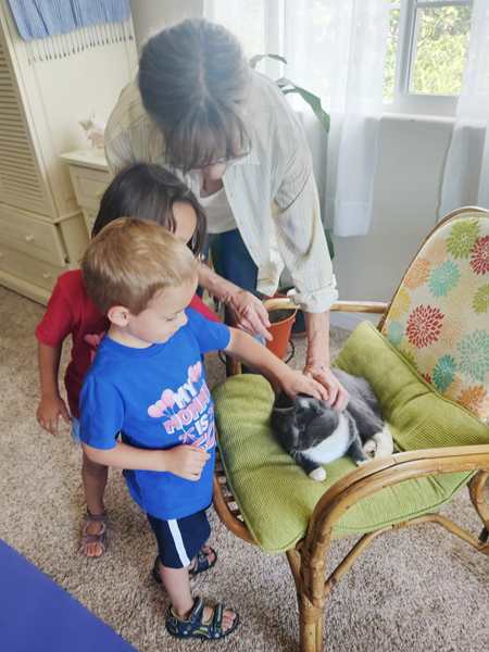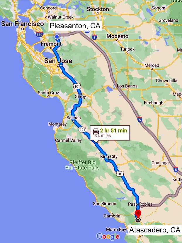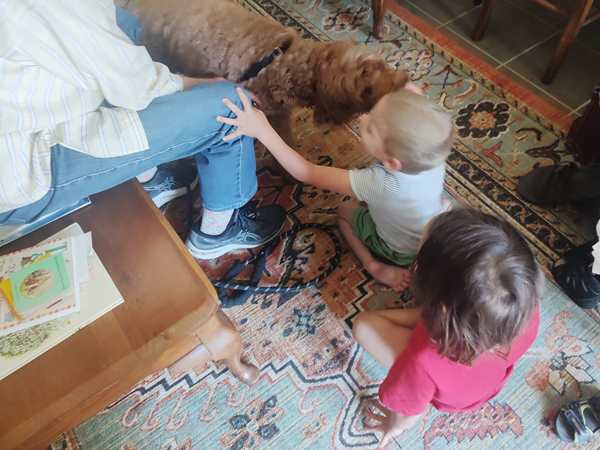 We were able to leave at 9:45 on our 3 hour-drive south. However, it ended up being nearly 4 hours, with a potty break as well as a stop to fill up the car with gas. Just after 1:30 we arrived at our friend's house in Atascadero. She had a dog in a crate that the kids really wanted to pet, but they had to wait until after lunch. Our friend had cooked a meal, and so we sat down to eat it. After the meal she let the dog out, much to the kids' delight. Sammy was the most happy and stayed close to the dog all day, asking for him, when we were not together. Emmy was fearful as usual, at least to start with. She also has cats and one was sleeping in the house, so they got to see it and pet it - until it ran away.