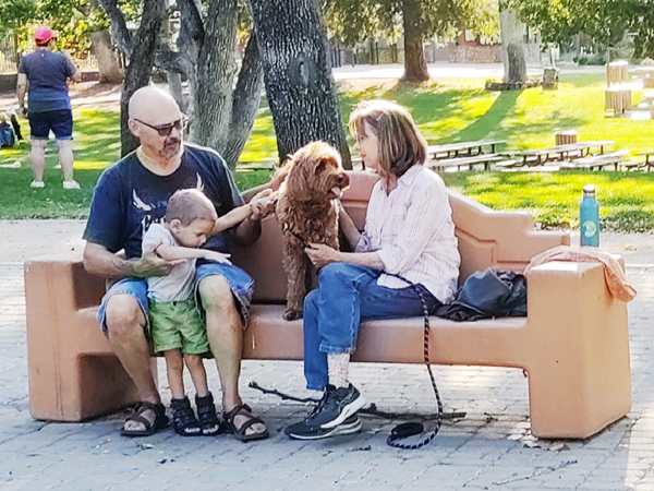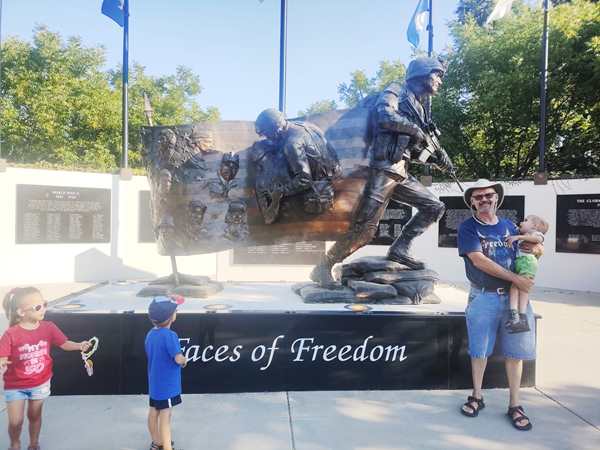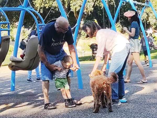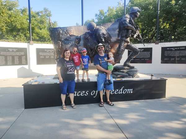 By about 4:45 they were all awake, and so we got ready to leave the house and go to the nearby park, where our friend was gonna meet up with us, so the kids could play at the playground. We got there just before 5:30 and started walking to the playground to meet up with her. We passed by a war memorial, and a passerby asked if she could take a picture for us. Then we continue on and found the really nice playground as well as our friend. Sammy had been asking for the dog the whole time and was really happy to see that she had brought him along. He then just petted him for the longest time, while Randy talked to our friend.