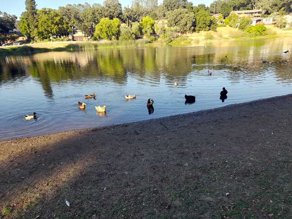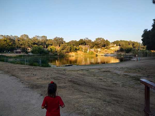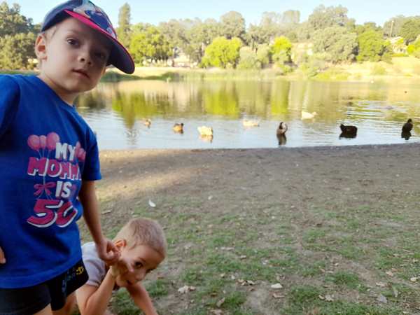 More and more people were coming with chairs and sitting down near where a local band had sat up. Our kids were a little curious and checked it out. There was a little lake there, and Randy took the boys there to look at the ducks. After nearly 2 hours at the park, and with the sun starting to go down, we decided it was time to leave. Together we parked to the parking lot, where we said our good-byes. Around 7:20pm we drove off.