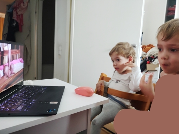Just after noon we sat down to eat. After lunch they continued watching, and they enjoyed the videos from just over a year ago, when they were older, more. It was so much fun, and I was with them, that we went a little over time and it was closer to 1:30 before they went to bed for their nap. I sat down by them and was glad that they fell asleep quickly.