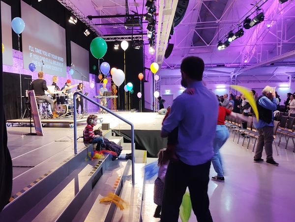 It was very cold and windy once again. When we got off the train, we bought some chestnuts, then we got on the tram that took us to church. The service starts at 5 pm with announcements, and worship then starts closer to 5:30, which is when we arrived. There seemed to be more people than usual there today. We walked to our usual spot and went to the front. Emmy and Tammy were excited about all the balloons everywhere, as there was a special celebration today. Emmy stood on the stairs looking at the musicians on the stage for quite some time. I had Sammy and had fun with him. At about 5:45 we took their food and went upstairs to the toddler room.