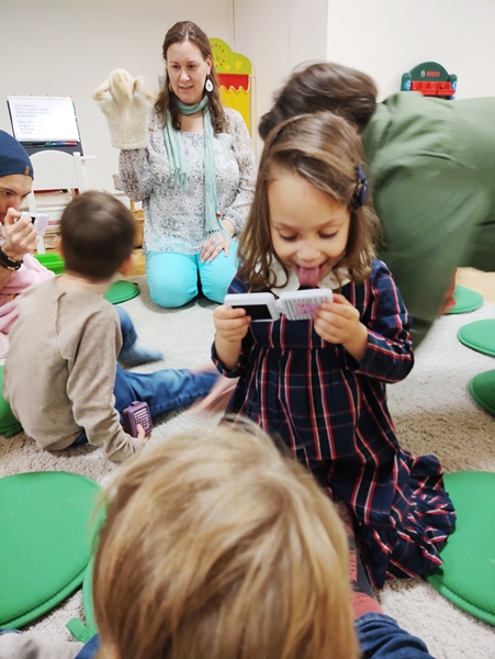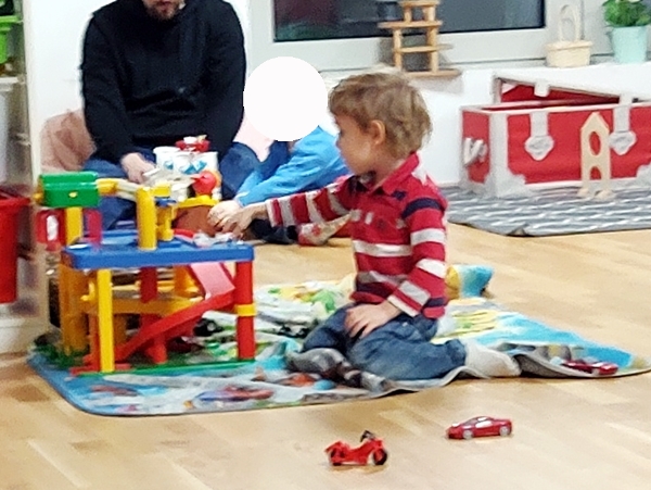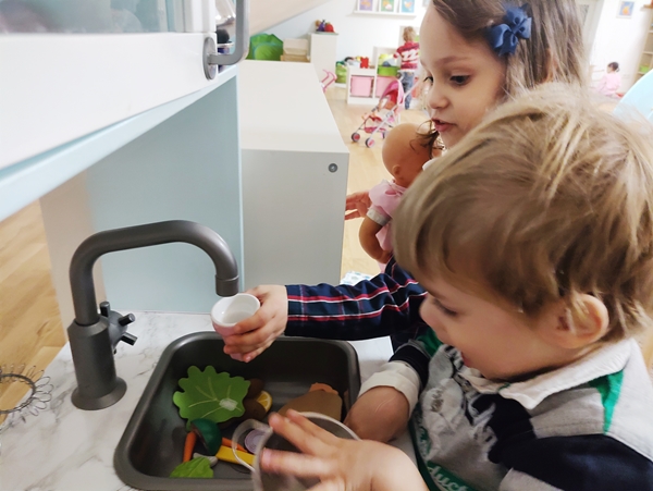 We were not the first ones there. Randy returned to the sanctuary, while the kids ran to start playing. Sammy wanted to play with the play kitchen, of course, so I sat down with him there to make sure he wasn't falling. Tammy got a doll and started feeding it, while Emmy was playing with cars.