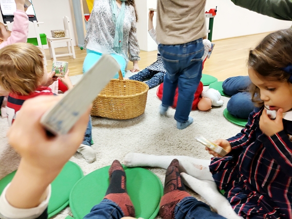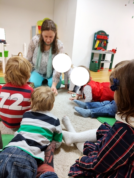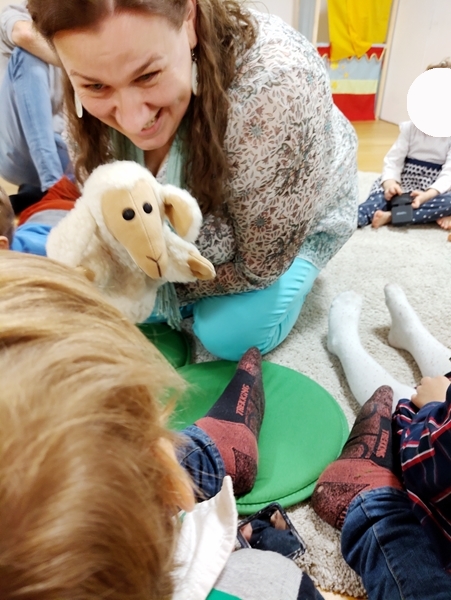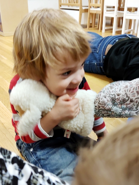 Then it was already 6 pm and time for the program. Sammy was not happy at all, when I pulled him away from the kitchen, and he stayed unhappy during the program, which has never happened before. We started with the general greeting song with actions, then the teacher did individual greeting songs for the kids, where they get to cuddle the hand puppet sheep. Then they got Bibles, and we did the Bible song, where they lift their Bibles high up into the air. Then the teacher started her teaching on God/Jesus being the winner, and us with him. The program wasn't long and ended with everyone holding hands and the teacher speaking a prayer. Then everyone sat down to eat.