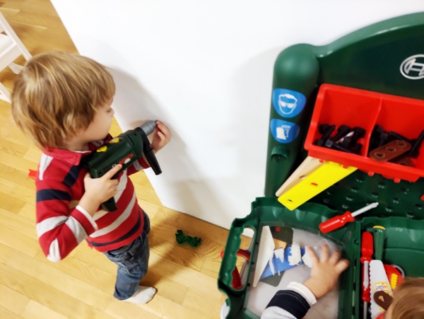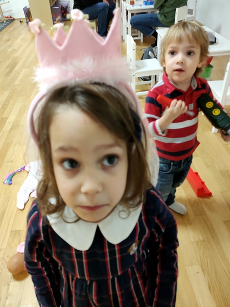 All our three kids ate very little, as they wanted to go play. Sammy wanted to return to the kitchen, so I took him there. Then he wanted to play at the workbench, and the other two also came by there. Emmy also played being Kasperl as there was a theater frame for it, and Tammy was dressing the dolls in princess clothes and put a crown on herself. Then Randy returned, and we put their shoes on to go back down to the sanctuary.