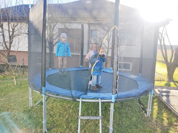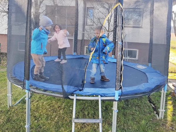 Even though it was a cold day, we stayed outside at first so the kids could enjoy all the fun stuff they had in their garden. First they went onto the trampolin, but didn't stay long. Then they went up and down the slide. Then Tammy went to the swing, while Emmy found a tractor he could sit on and petal. Sammy also got to sit on and ride a car. He started saying that he was cold, so we went inside.