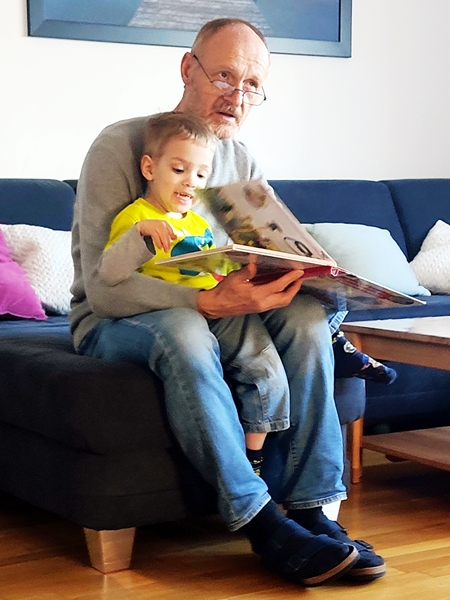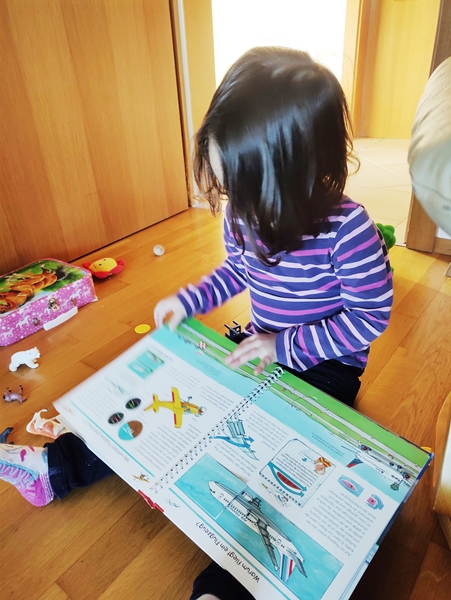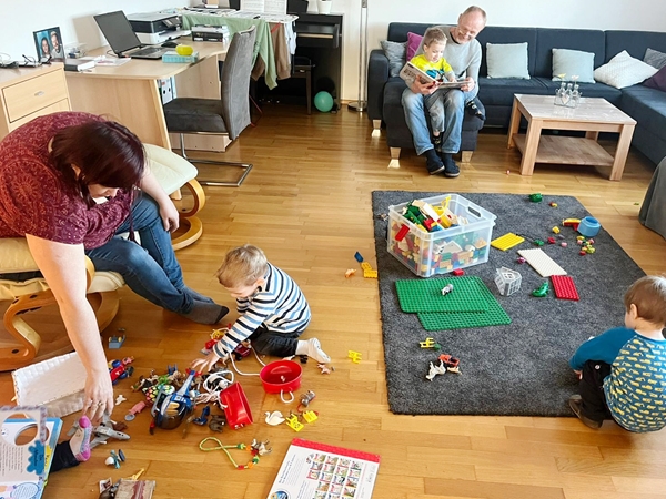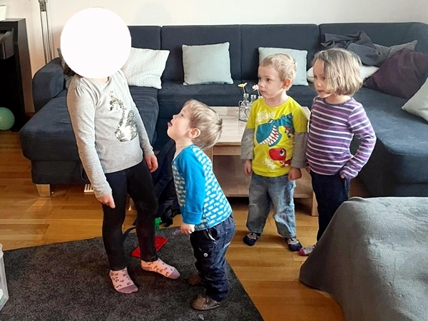 Just inside there was the cat sitting and sleeping. All our kids petted the cat who did not mind. Then we went all the way inside, where we had some cake. The kids did not stay at the table as there were too many toys to play with, and they were having fun. One of my friend's kids was older and her other one younger than our kids. Tammy then started reading books, while Emmy had the Dad of the house read to him. Sammy got to play in the toy kitchen, as did the others. Once our friend's youngest foster daughter arrived who is two years older than our kids, the fun level went up even higher. Tammy had found another girl friend and had just so much fun with her; they all did. We adults stayed at the dining room table for most of the time, talking with each other as much as was possible. I was still so extremely tired and had no appetite to eat anything.