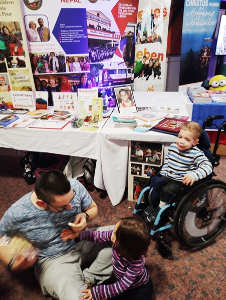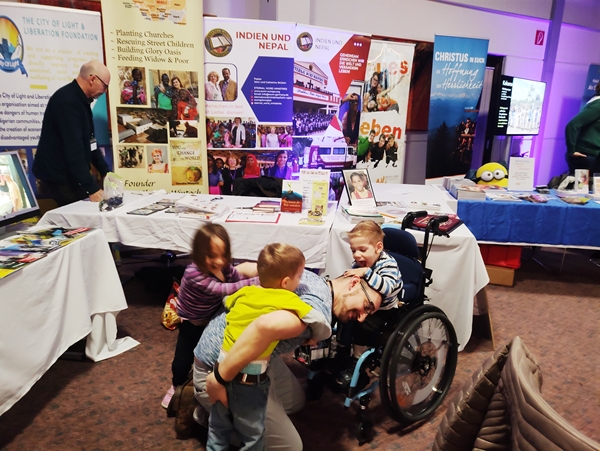 Just after 6 pm we had to say our good-byes. We put the kids back into the car and left drive to the church, where the conference was starting tonight. We got there at 6:45, but only found parking a little away. Unfortunately I don't have that handicapped sign yet that you put into the car so that you can park in handicapped spaces. It would have been convenient to park right next to the entrance of the church. Randy got Sammy's wheelchair out, put the wheel back on, and we put Sammy into it. We got all the stuff for our table and started walking towards the church. Once there, we got our name tags and looked to find where we had our table. Most other missions had already finished setting up their tables. We started getting our stuff out, when a guy approached us and offered to help. He started playing with the kids who were having the greatest time with him. I was thankful the kids were occupied so that I could set up the table.
