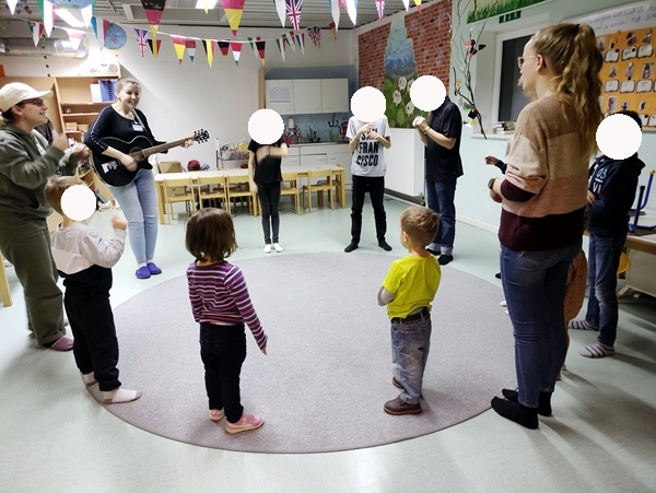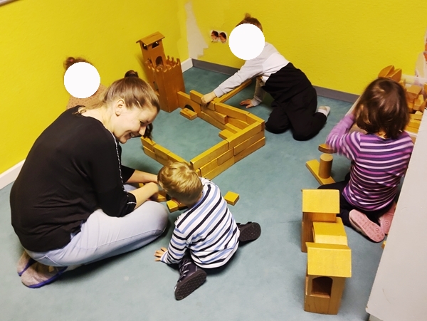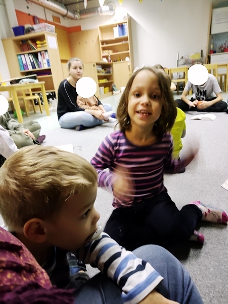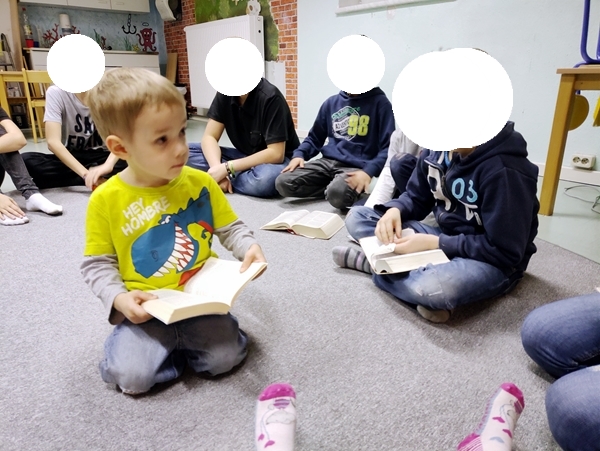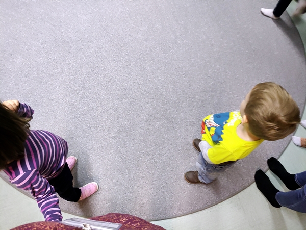 It was for kids 3 years and up, and there was a good number of kids already there. Our kids joined a little group in the corner who was playing with blocks. I then left Randy there with the kids and returned to the sanctuary. I was enjoying worship, but not for long, when Randy texted, asking for the diaper bag, so I left to take it to him. He took Sammy to change him, while I encouraged the other two to participate in the program. There was some worship, songs with actions, that our kids did not know. Then we sat down and they distributed Bibles to those who can read. Emmy took one. The lady showed him, where the passage was, and after one kid had read, he pretended to read and said, "Once upon a time there was a wolf in the woods." It was hilarious.