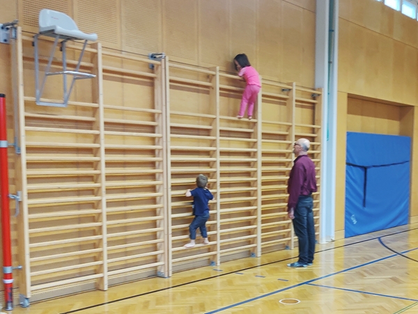 In any case, the kids were excited to be in the gym and started running and climbing up the walls. Tammy climbed all the way to the top and was proud to show that she could do that. Emmy was still a little fearful, as he does not like heights.