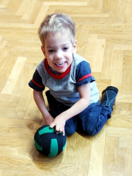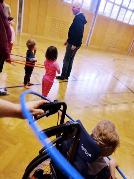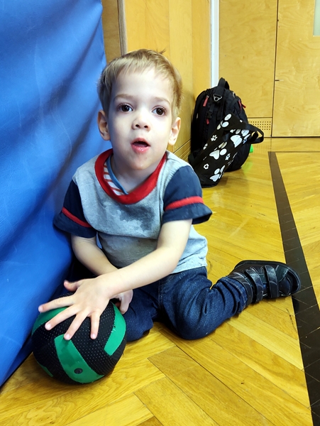 At 6 pm the teacher and other participants came in. In fact, there were a lot of people today. He started handing out hoops to begin with the typical race of the kids inside the hoop and the parents holding the hoops. Three times we ran to the other end of the gym and back. Randy ran with Emmy and Tammy, and I pushed Sammy in his chair. Then it was time for them to lie down on the ground, and we pulled the kids who were holding on to the hoops. Sammy just loves that part. We did that a few times as well. Then the teacher handed out balls to everyone, and the kids started running and chasing and trying to hit us with the balls. I was playing balls with Sammy for a while. He then also wanted to climb up the wall, and he did really well. He lifted his left leg up to the next sprung, then had a little bit of a hard time putting his right leg on the same sprung. But he was motivated to go up, and upset, when I got him down. Then I left with him to change his diaper.