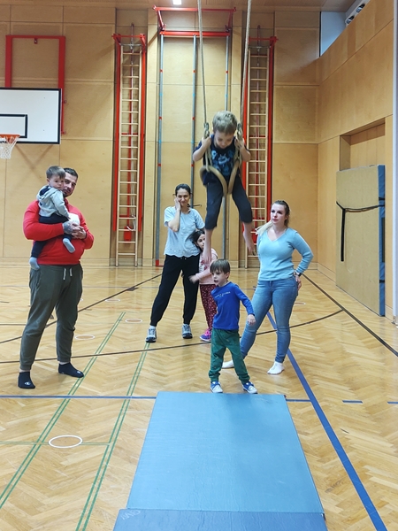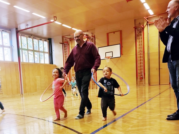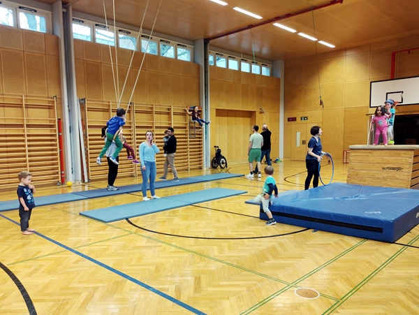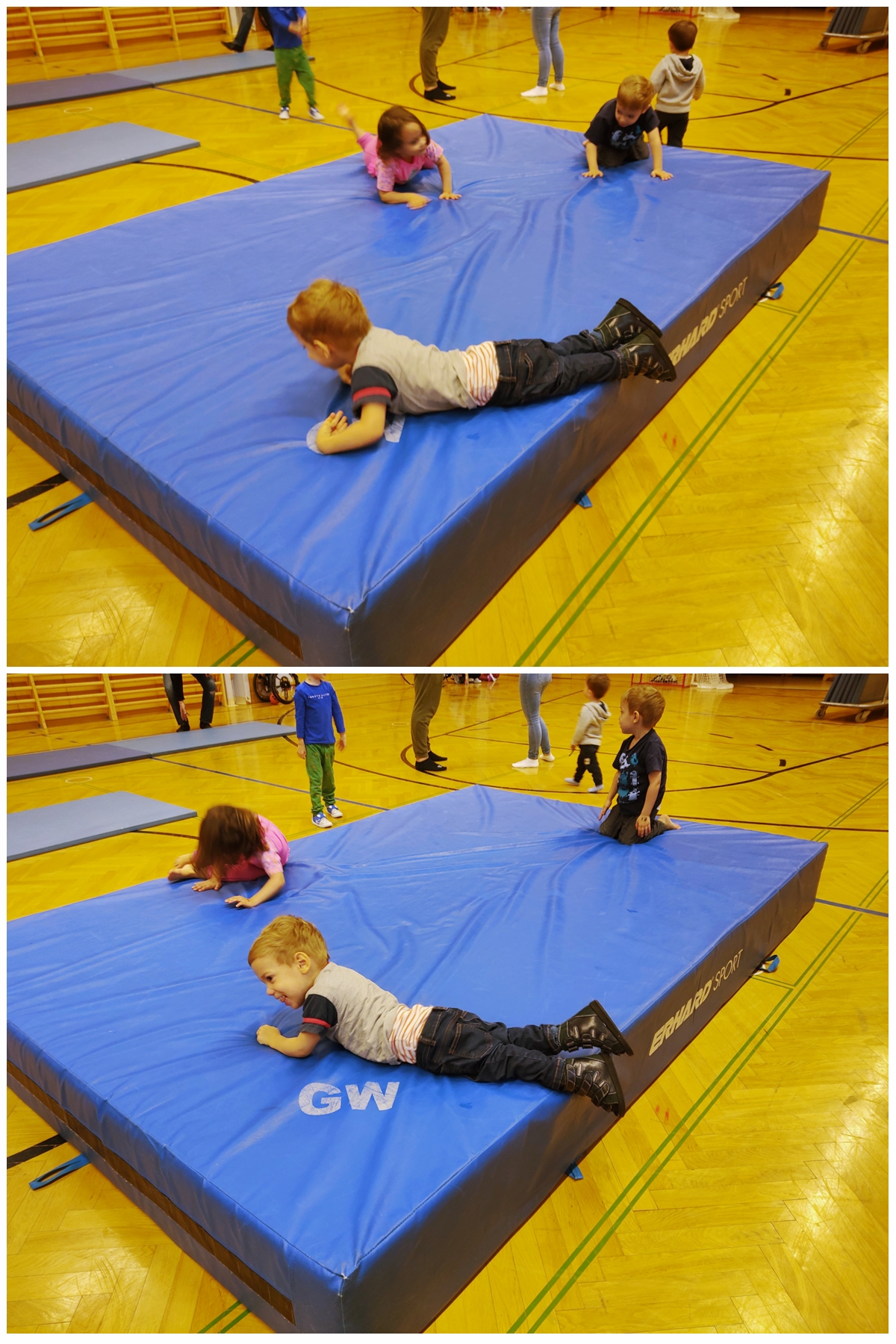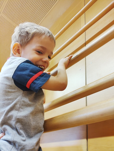 When we got back, all the equipment was set up. Tammy and Emmy were walking up the bench to jump of the vaulting box, and today Emmy was not scared of the height for some reason. The rings were also down, and our kids lined up to get on them. All three got to swing and had fun, Sammy being very upset again, when I pulled him out. He was trying to bite and scratch me in his anger. I then suggested to the teacher to have a second set of rings, so the kids did not have to line up for so long, and he got them down. From then the wait times were short, and the kids were loving it.