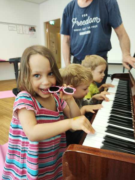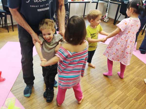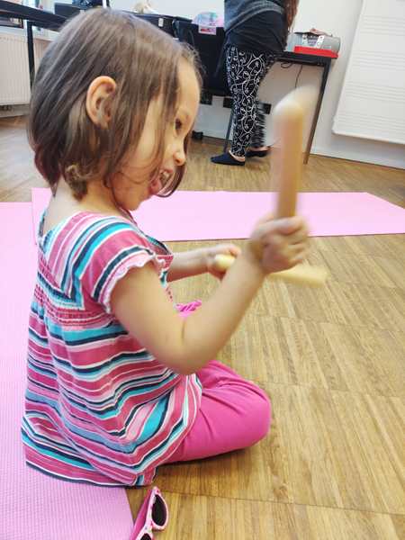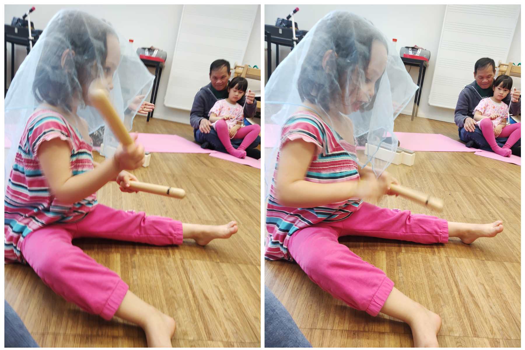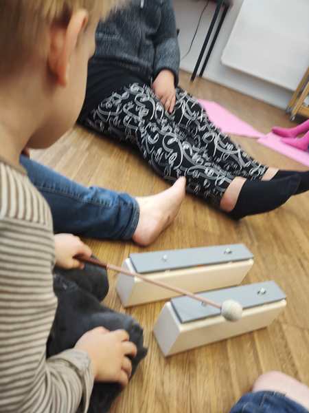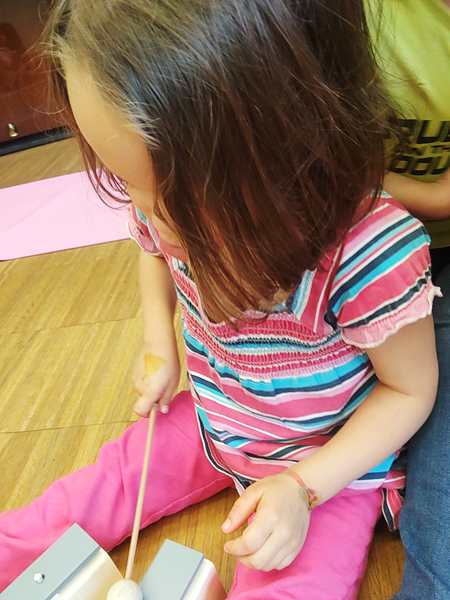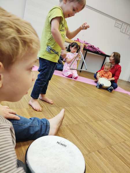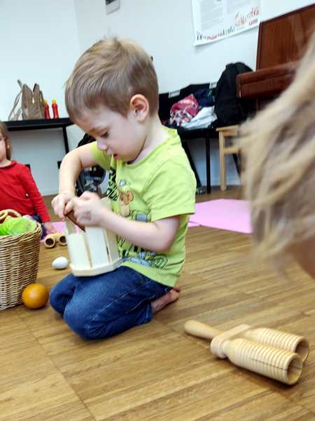 We walked inside, took our shoes off, then the kids spotted the piano and started playing it, with the teacher's permission. They were really enjoying it. Then the class started. The kids all took instruments to play, and the teacher passed around the two sound bars for each child to play. She did some songs with actions, but especially Emmy was not very motivated to participate.