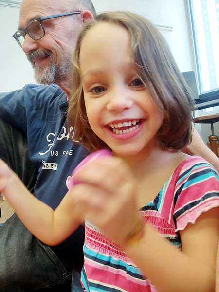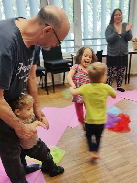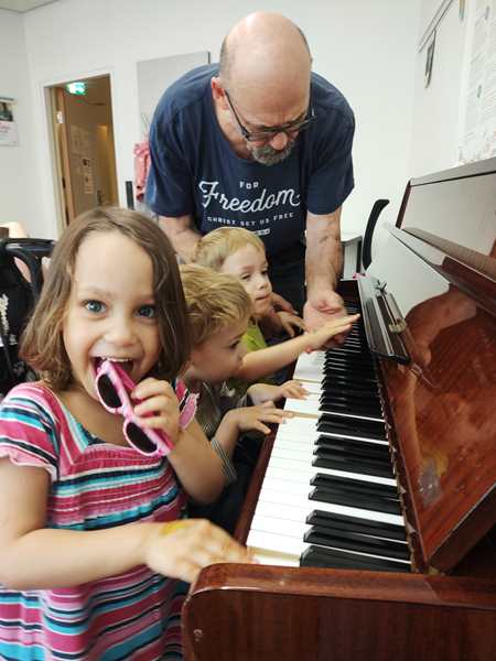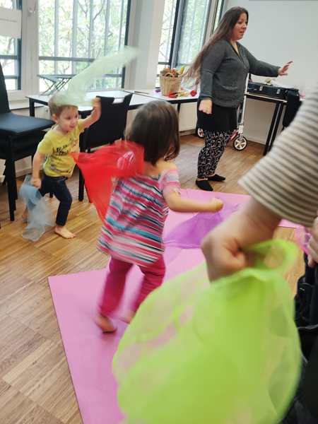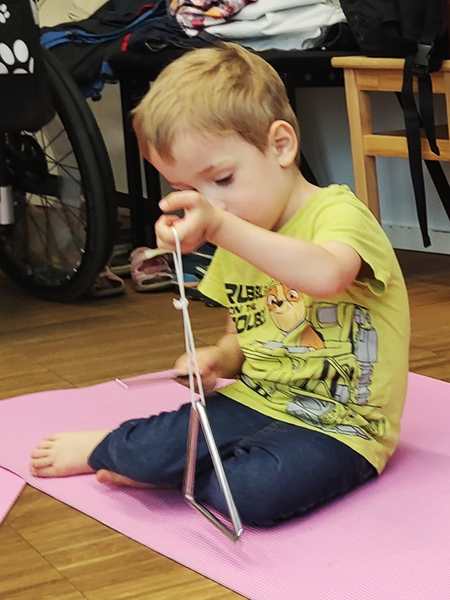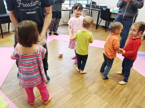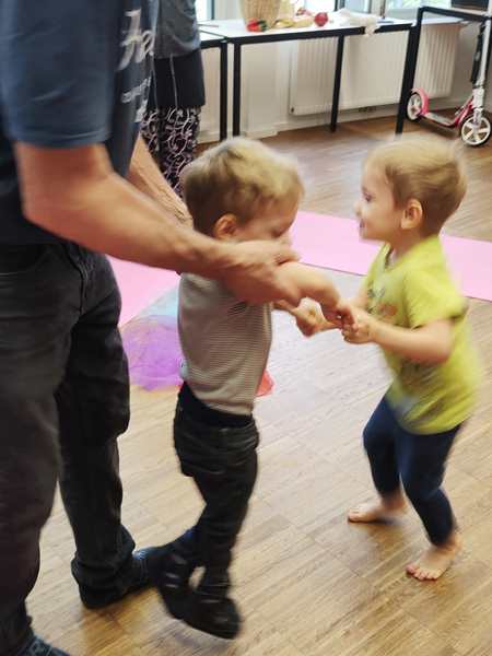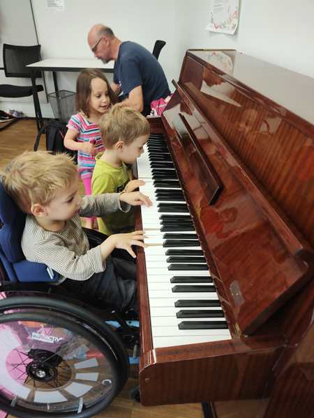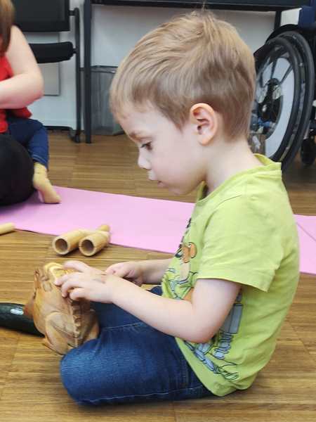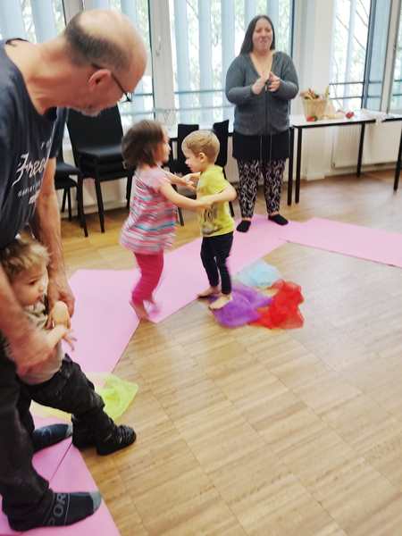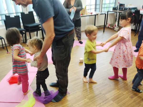 We walked inside, took our shoes off, then the kids spotted the piano and started playing it, with the teacher's permission. They were really enjoying it. Then the class started. The kids all took instruments to play, and the teacher passed around the two sound bars for each child to play. She did some songs with actions, but especially Emmy was not very motivated to participate.