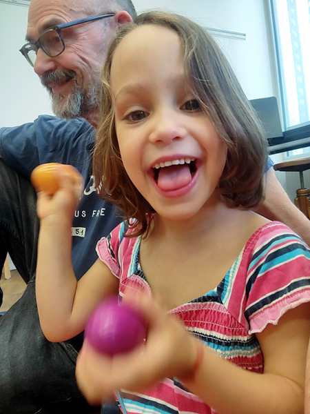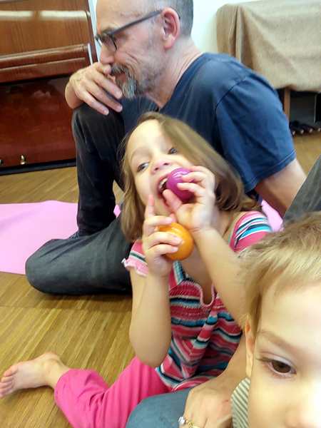 Then all the kids got to choose an instrument that they then played, but only when it was their turn, which was when they had the fabric over their head. Then she did a good-bye song, and the class was over. I'd had Sammy for much of the time, and he was hungry at one point and eating, so his siblings ate as well. She then asked us not to let them eat, or everyone would want to. Randy then took Sammy to the corner to give him another squeezie; otherwise he would have just been cranky and not participating.