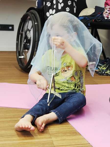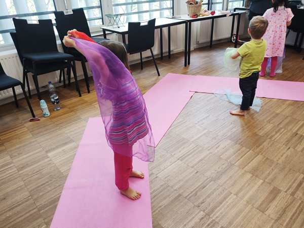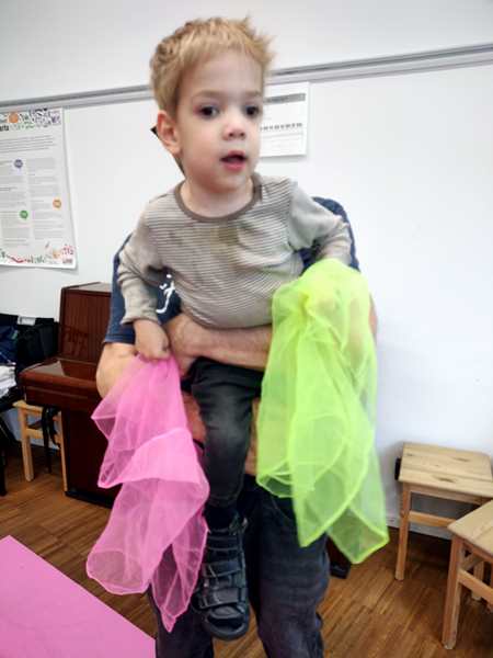 The teacher handed out two pieces of fabric to each child, and everyone danced to the music. Then we did a song, where the child in the middle picks one other child to dance with. Emmy got picked once, and then Emmy chose Tammy. Sammy danced with Tammy. In the end the six kids present all danced in pairs of two. It was really cute to watch.