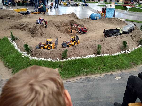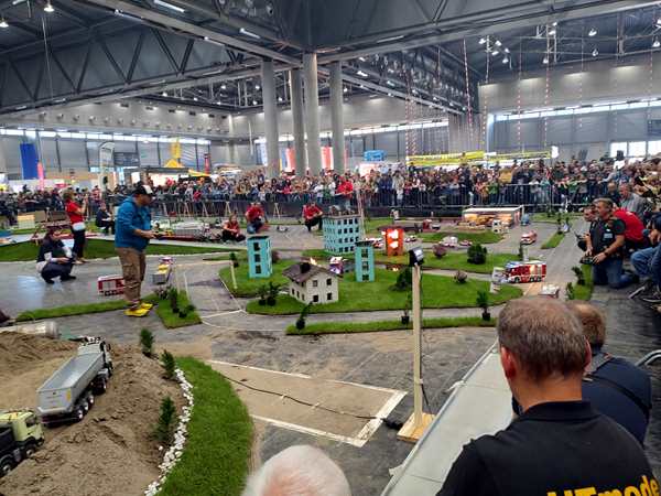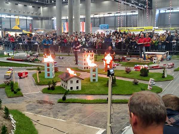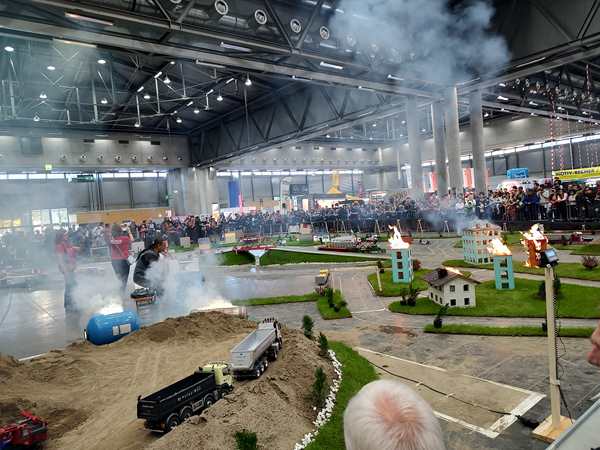 We walked into the building and in the direction of the hall we needed to go to. The show I wanted them to see was to start at 3 pm, which was about 15 minutes away. They scanned our tickets, and we entered the hall. It was huge. I saw a map, but did not see the name of the area where the show was to be. So we started walking and soon found it. I asked someone there who confirmed to me that we were in the right spot. We moved to a different spot along the fence, where we could see the area we needed to see better. Then we still had a few minutes to wait. Sammy was extremely cranky, just whining and whining. I was holding him and trying to cheer him up. I put him on my shoulders for a while, which worked a little bit, but not for long. When the show started, they only had those model cars and trucks and vehicles move around and explained them, then they came to right where we were, where they had a work area with diggers etc. set up, and started moving those vehicles. While Emmy and Tammy were interested, Sammy still didn't care and was whining constantly. At 3:40 pm what we had waited for finally started. They set a few buildings on fire and had the model fire trucks come to put it out. That finally got Sammy's attention. They all enjoyed watching it - from the fire and smoke to the sirene and water.