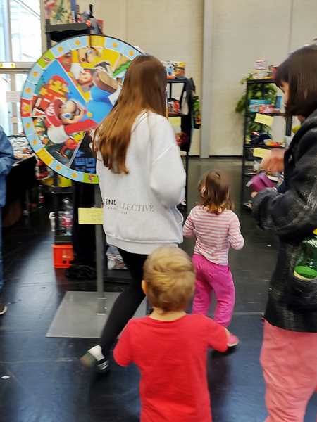 Next we walked by a wheel of fortune. They let Sammy turn it for free, and he got a lollipop. Then the other kids turned it and got small gifts as a reward.