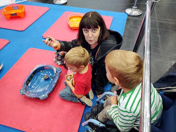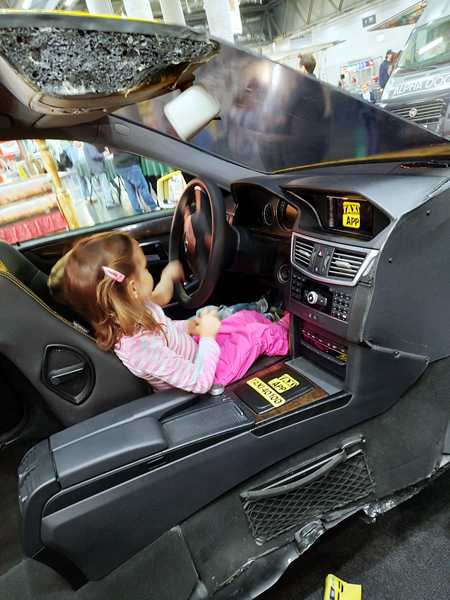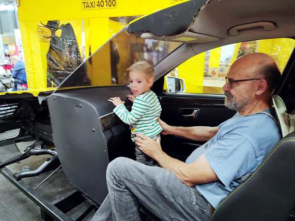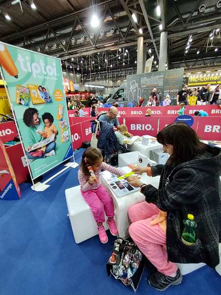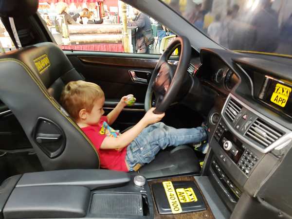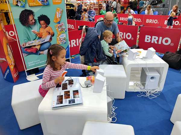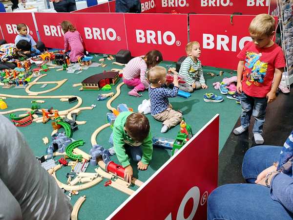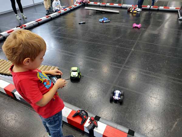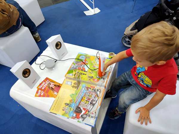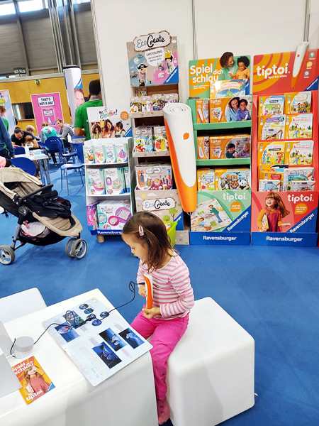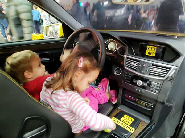 The area where we were had all kinds of different things to try out, so that's we did. There was a taxi cut into two halves, and the kids climbed in to sit and drive it. Emmy was excited to be at the wheel. There was also a simulator, but he wasn't tall enough to reach the pedals. Then there was a huge area to build train tracks, but they didn't care to stay there. Then we found the Tiptoi area - something they have at home and love - and so all three kids started looking at books with the talking stick. I needed to go to the restroom, so Emmy came with me. We started walking around and looking for them and looking at areas we hadn't been to yet. There was the area for model planes to fly, and really big remote-controlled cars, as well as variations of all that. It all took us quite a while before we got back to the Tiptoi area; Randy had already tried to call us, he said. The other two were still having fun with the Tiptoi books. Emmy walked with me to where the small remote-controlled cars were, but the controls that were available were all not working, so we didn't stay long.