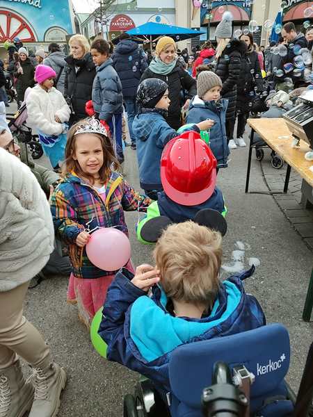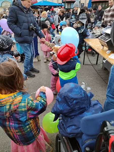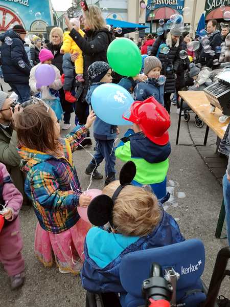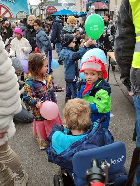 When we got off the subway, we could already hear the music and someone speaking. We were heading that way, together with other parents and kids who had gotten of the subway. It was supposed to start at 2 pm, and it was just after. There was already quite a crowd at the main square there. We started walking around and found the balloon station first. Each kid got a balloon with a cord. I tied them on their arms. Then we walked on and saw a bubble machine blowing bubbles into the air. We walked on and found where they had set up a few games, but nothing interesting. The kids wanted their faces painted, so we headed that direction. We found it and lined up with the other people.