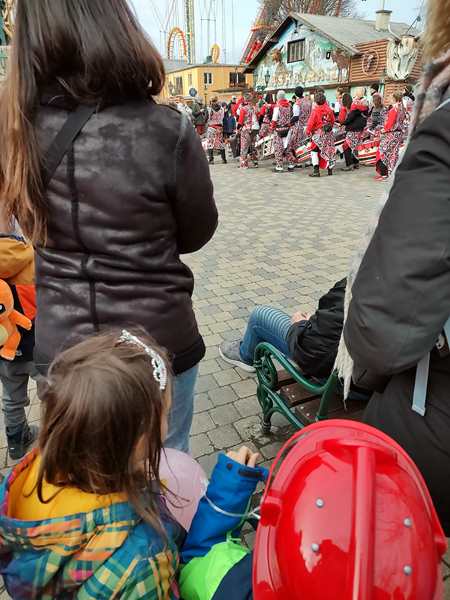 We stood there for quite a long time, but it was moving extremely slowly. The parade had already left. Finally we decided to give up and started walking in the direction the parade had taken. There were lots of people everywhere. We walked by lots of rides, and some were open. Some were even kids' rides, but the kids were okay not to ride them. We were heading to the other end of the park, where Kasperl has his home, and then from there, it's not that far to the other subway stop. There are also lots of kids' rides near Kasperl.