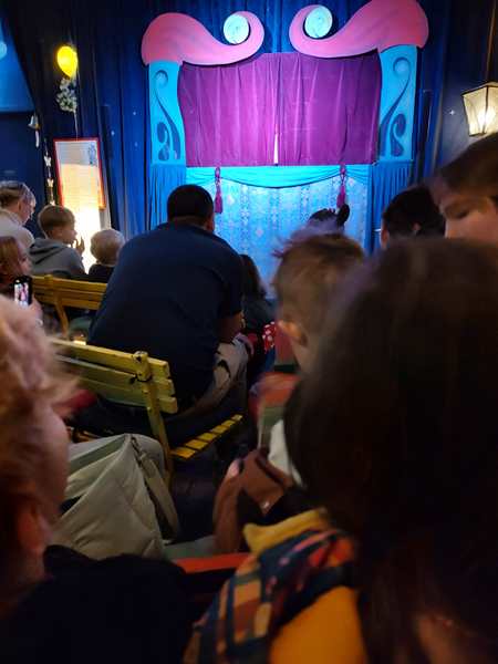 We reached the theater at 2:40, and the first show was at 3 pm. There was already a long line that we joined. A few minutes later they opened their doors, we bought the tickets and found ourselves seats in the middle. We hadn't been there in a long time, so the kids were really happy. I had Sammy sitting in my lap, and the other two to my left and right. We still had to wait for more kids to come in. In fact, I've never seen the theater this full before! The show of the day was called "The ice crystal". It started with the crocodile showing up, and even Sammy took notice and laughed. What he enjoyed most was the music, moving his head and arm with the rhythm. They all enjoyed the story/show they were watching. Then we put their coats back on and left.