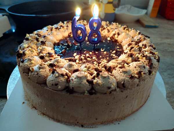 Then I got the cake out, put candles on it, and carried it to the table. We sang HAPPY BIRTHDAY (again), then Randy blew out the candles. It was time for the gifts. The kids had made drawings for him, and he opened the box that was from me. I got him ice-skating shoes, so that all of us now have shoes and can go ice-skating together. Then everyone had some cake.