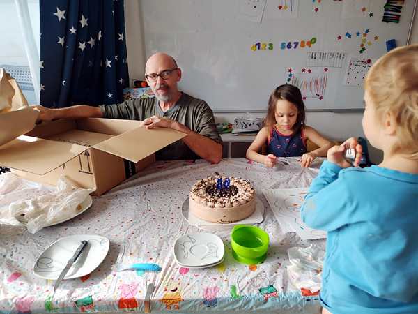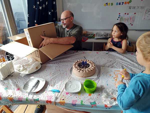 Day 1629. Tammy now sleeps most of the night between us in our bed. Last night she was really restless, moving all the time, and then Emmy came and left a few times as well. As as result I was awake way too much after having gone to bed late. And so I was really tired this morning. Randy got up at some point to make breakfast for the kids, while I had set my alarm for 8:30, as I was teaching at 9 am. It was hard getting up, and I was still very tired, when I started teaching. I then taught for two hours, while Randy and the kids were downstairs, where they were playing. After I was done, they came upstairs and Randy went to the grocery store. He had about an hour, as the food delivery was supposed to arrive by noon at the earliest. And they were very ponctual. As Randy wasn't back yet, we waited for him. Then we unpacked it all and put it on the table that I had put a birthday tablecloth on. Spareribs, wings, chicken nuggets and pizza. Everyone got to eat what he liked.