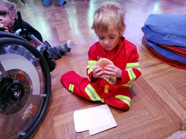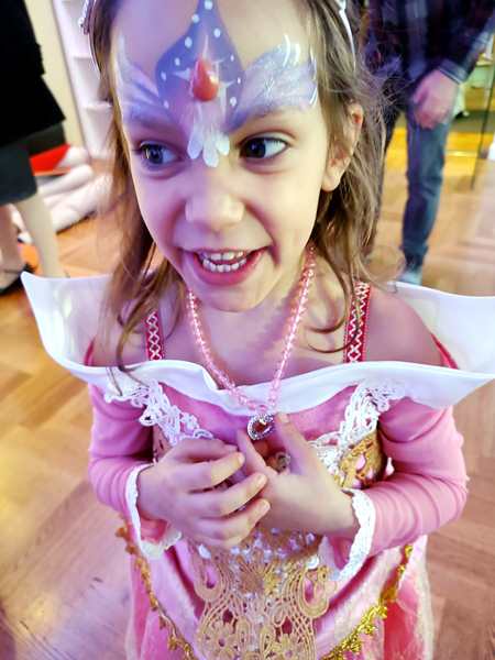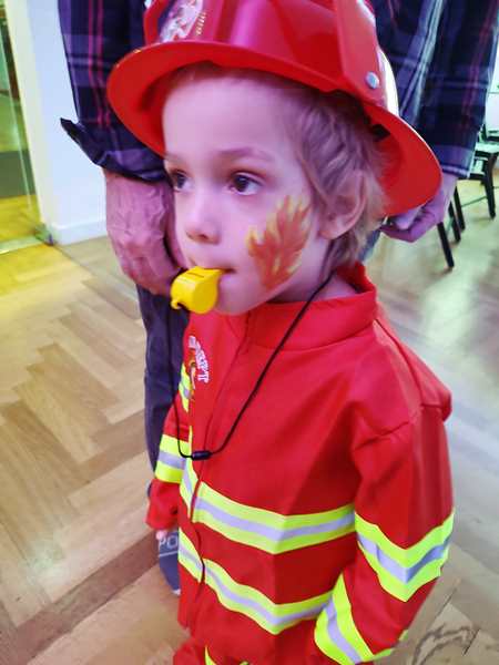 We then saw the face-painting station and stayed there, lining up patiently so that our kids could have their faces painted. It took a while, and one of the dance teachers tried to get us to come to the room, as they wanted the kids to participate in the games there. We still stayed. And then it was our turn. Sammy went first, and she painted Mickey ears and a nose on his face. He had no issue with it at all and did great. Tammy came next, and she wanted to look more like a princess. Emmy came last. What do you paint on a fireman's face? She said she couldn't do a firetruck, so she ended up painting fire.